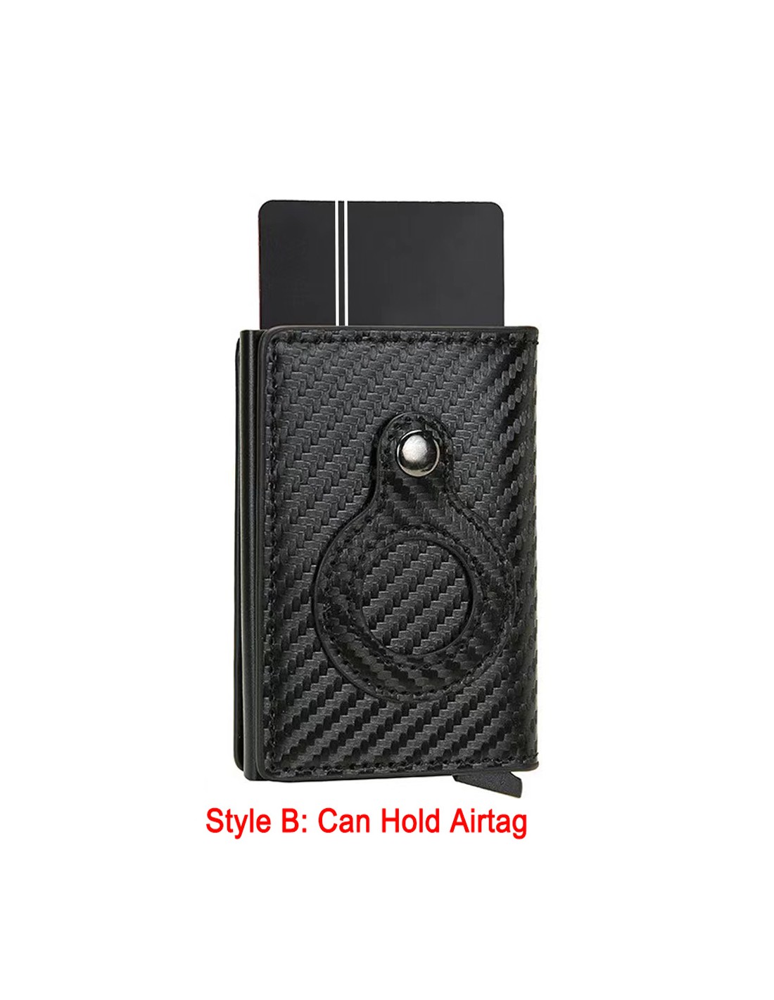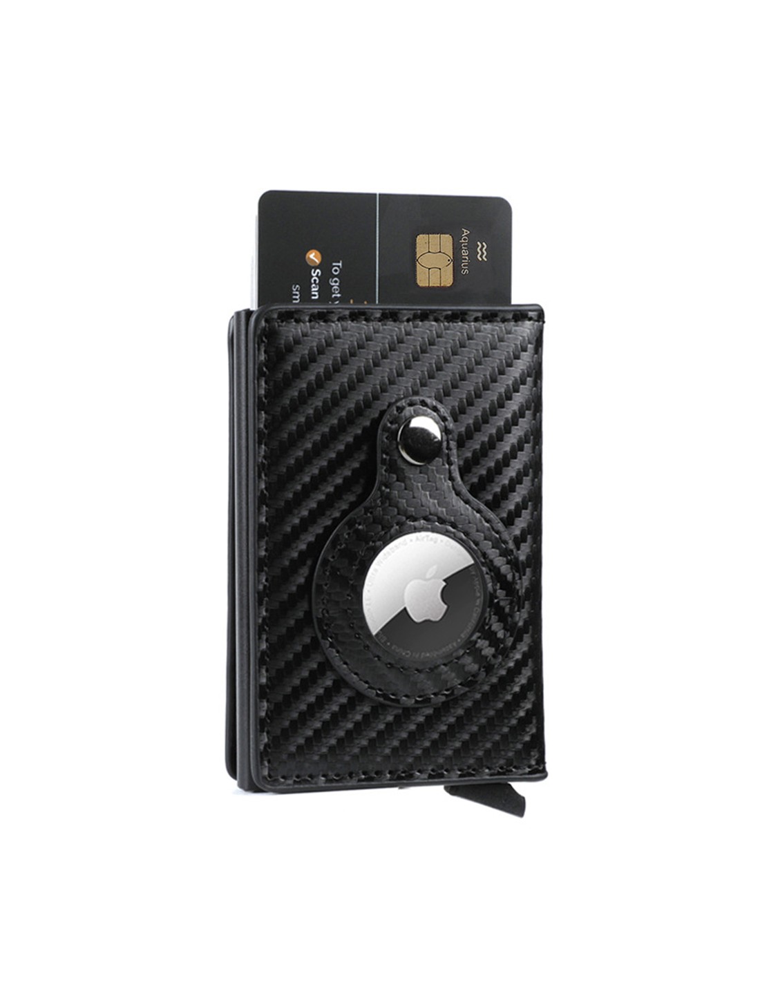 Porta-cartões em fibra de carbono com suporte para AirTag. Design compacto, bloqueio RFID e capacidade para até 8 cartões. Segurança e elegância num só acessório.