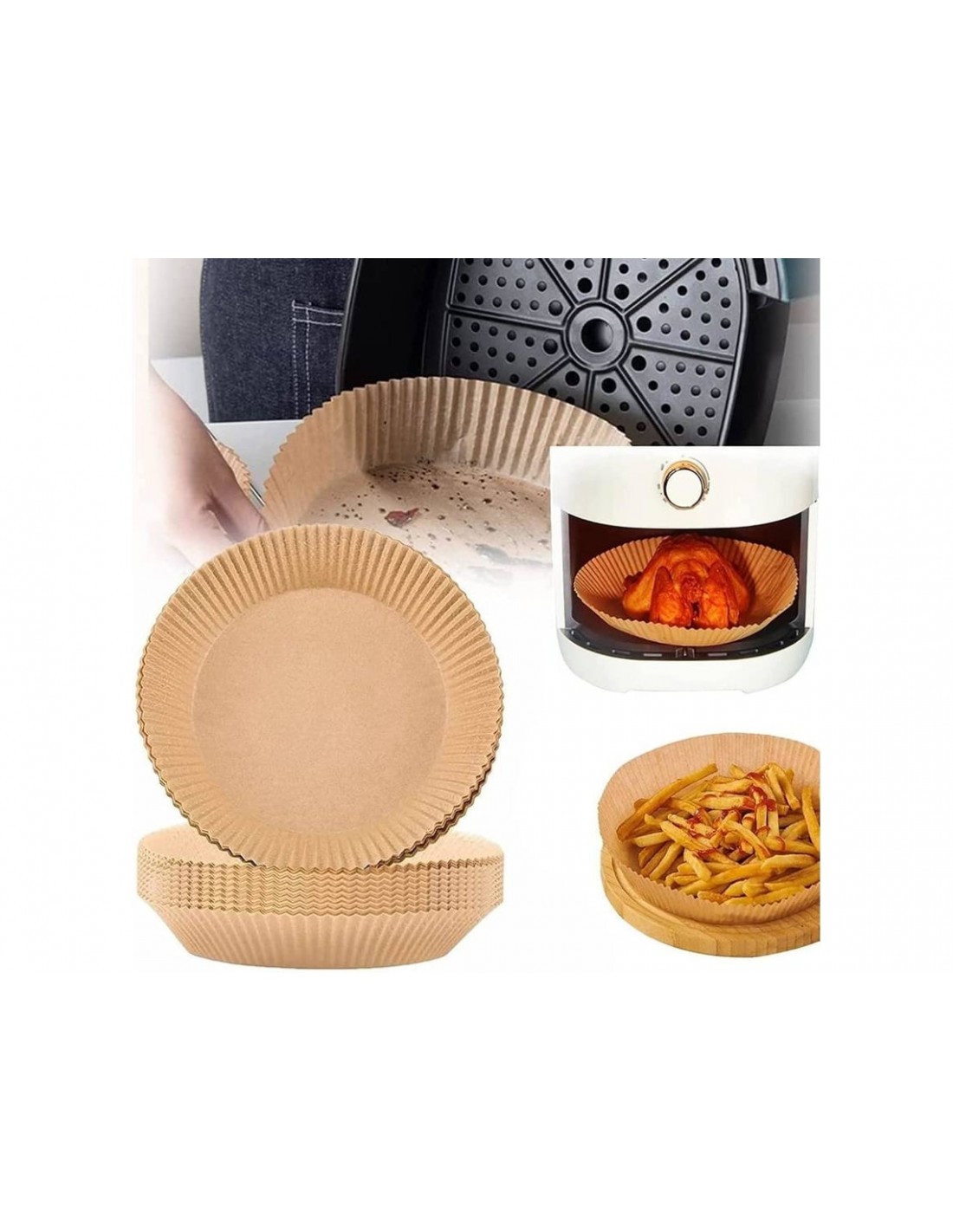 Papel antiaderente para airfryer de 20cm, ideal para cozinhar sem sujeira. Resistente ao calor, descartável e compatível com a maioria das fritadeiras. Pacote com 50 unidades.