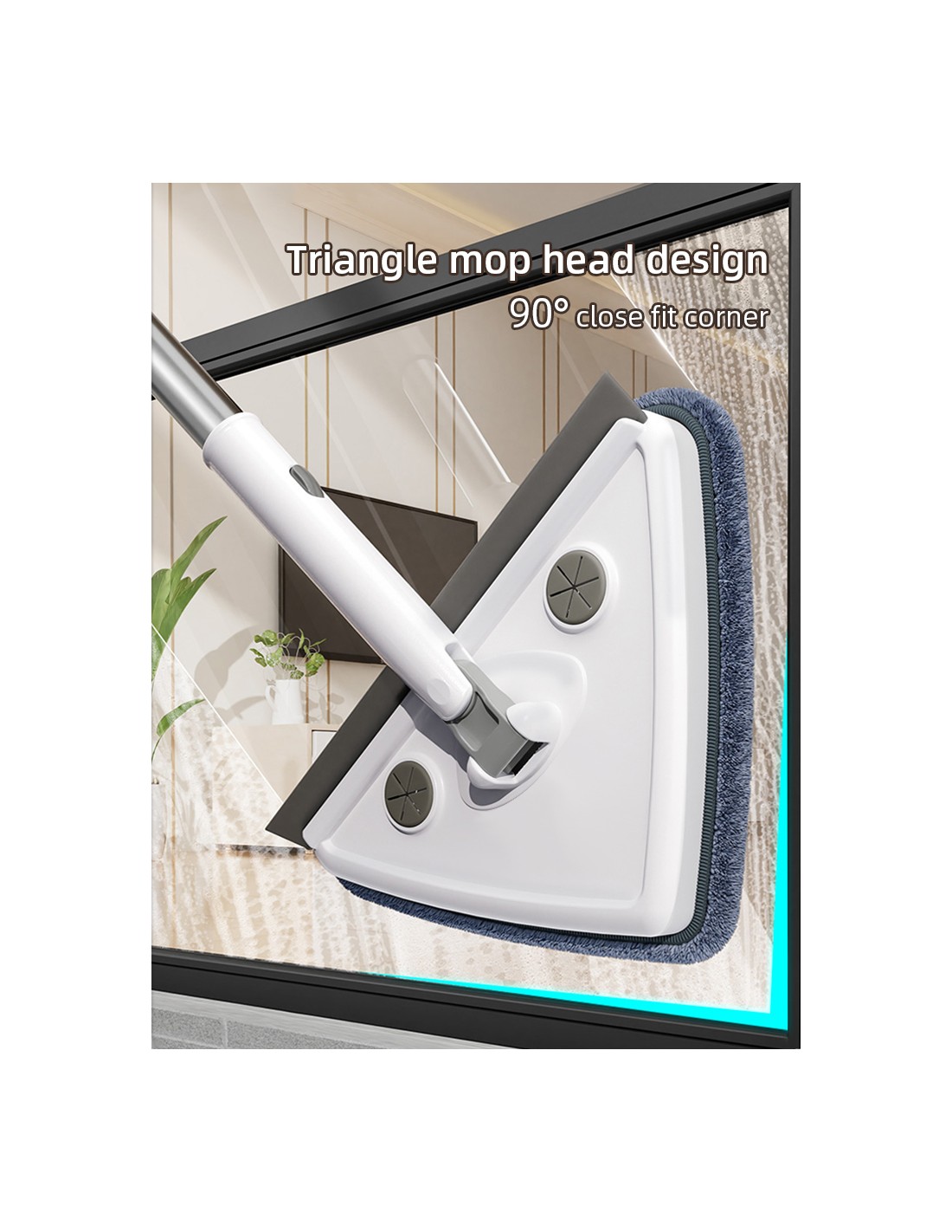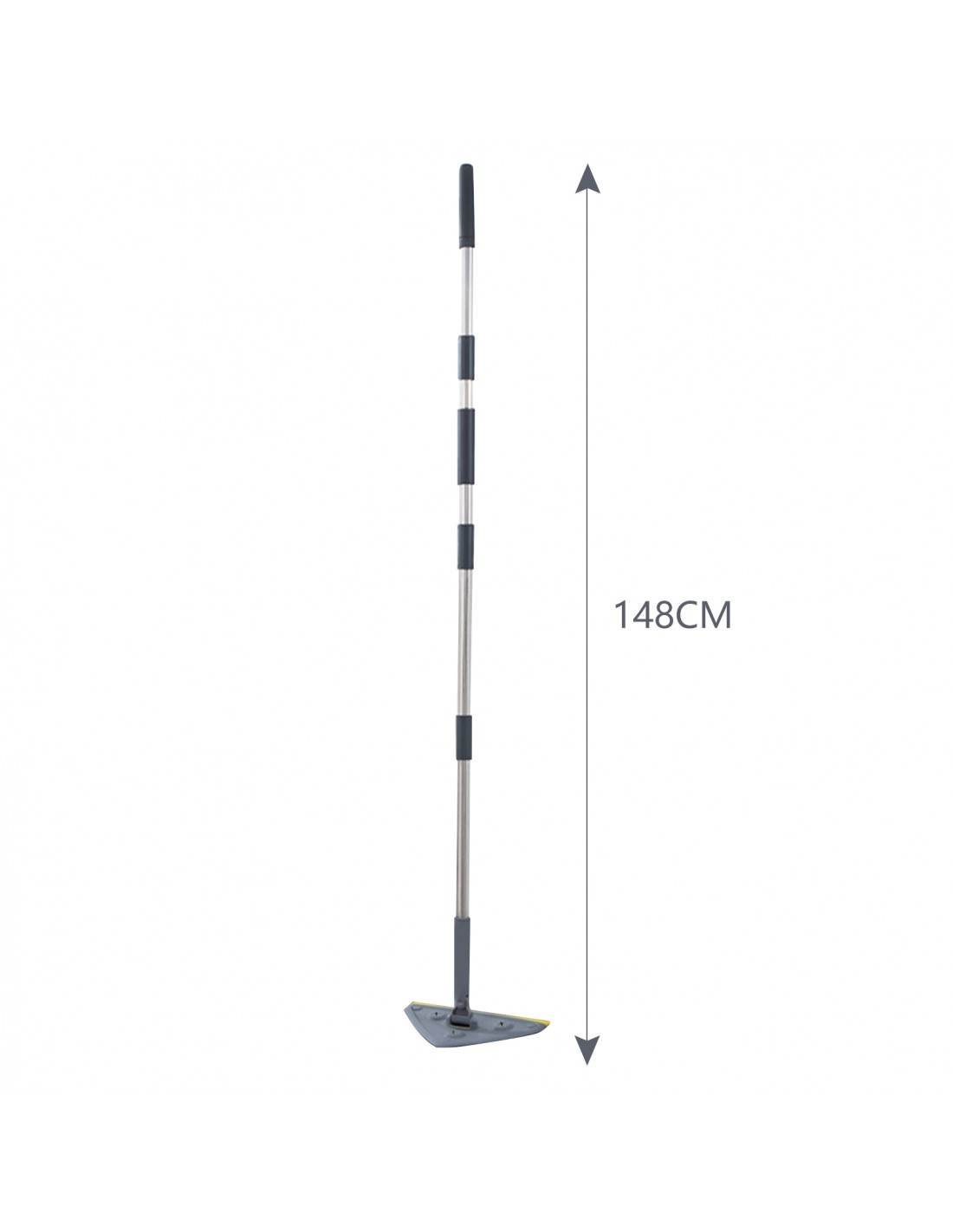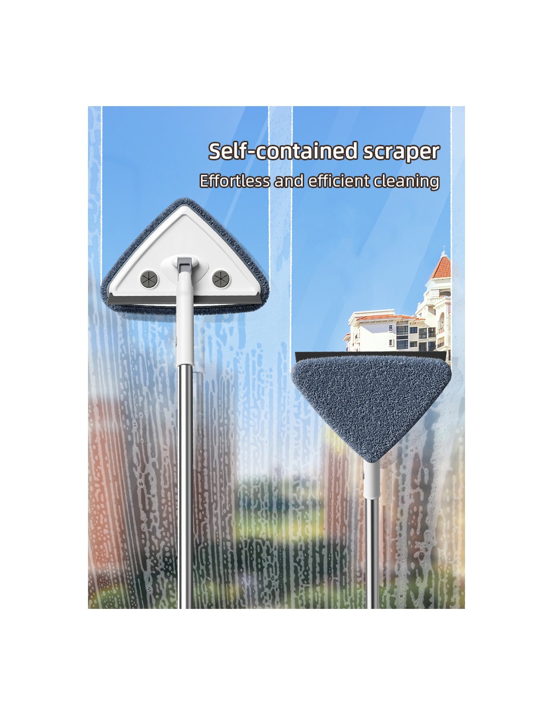 Esfregona de limpeza telescópico com design triangular e raspador integrado, ideal para limpar janelas e superfícies lisas. Cabo ajustável, leve e ergonómico, com pano de microfibra reutilizável para máxima eficiência.