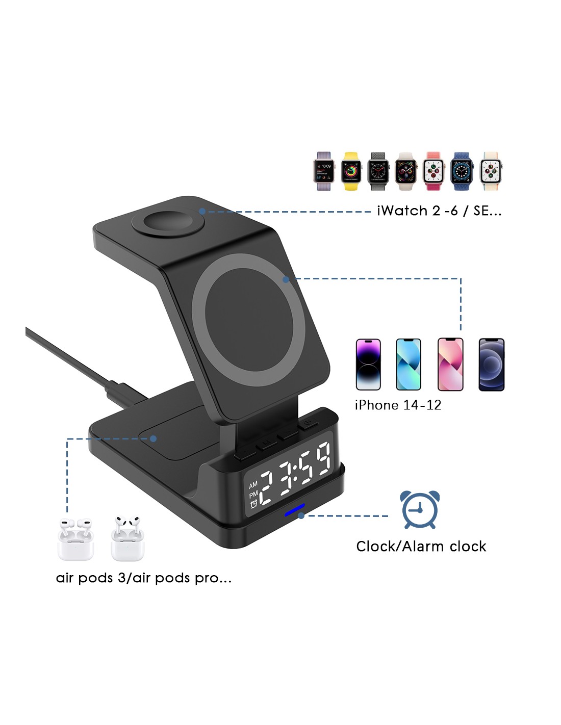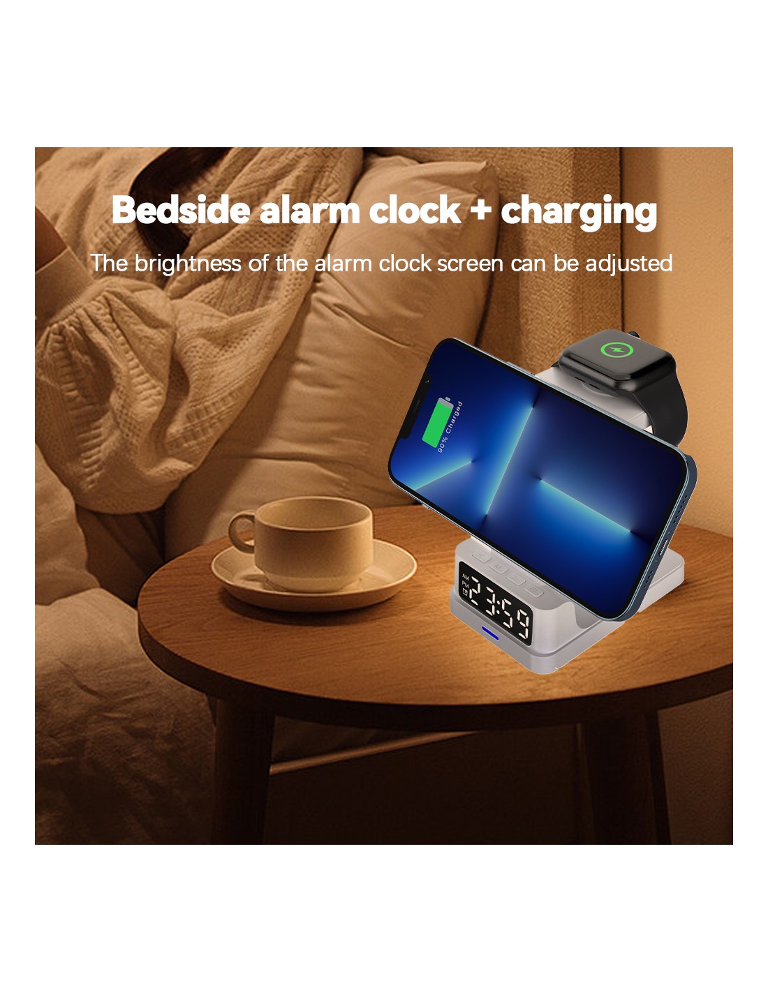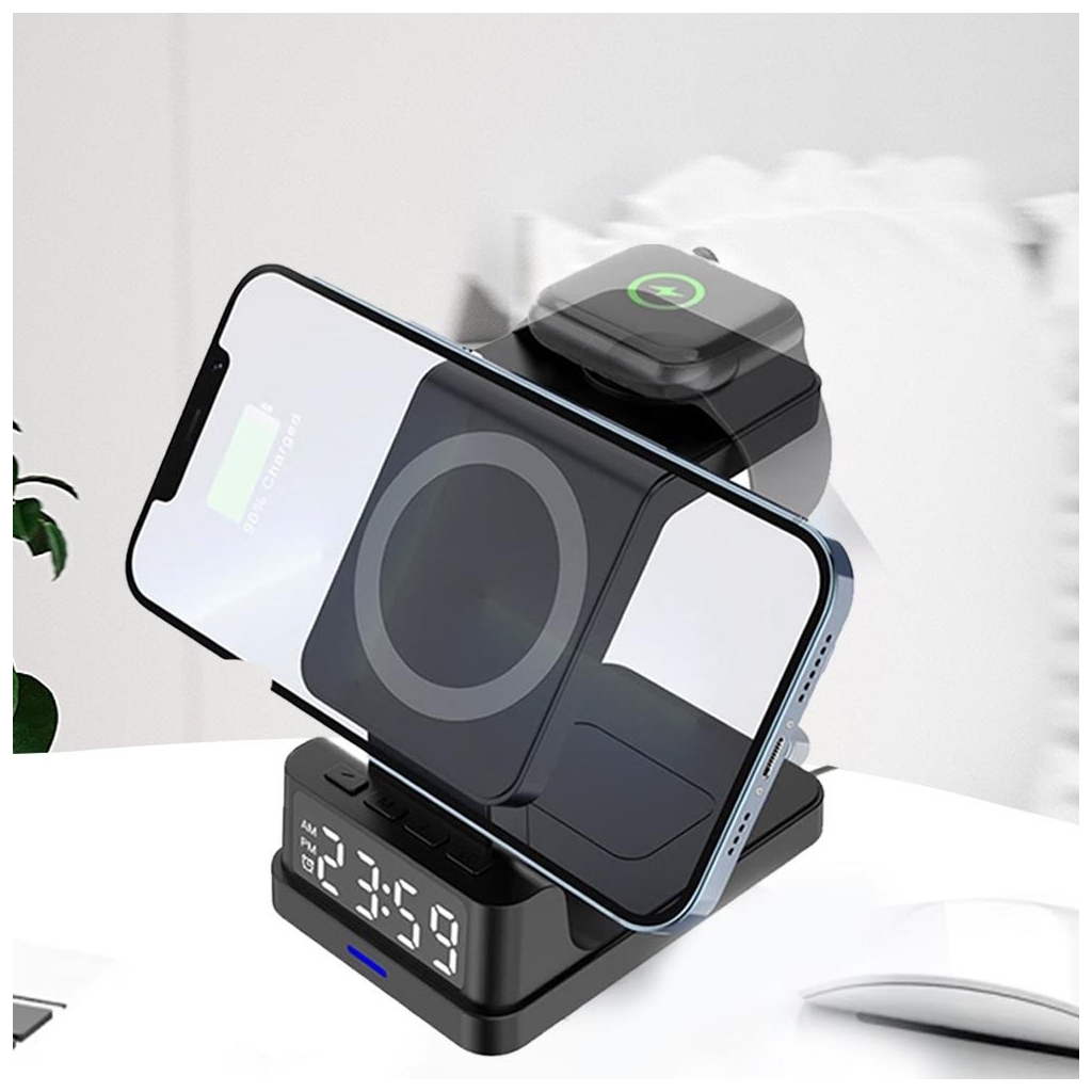 Carregador Sem Fios 3 em 1 com Relógio Digital