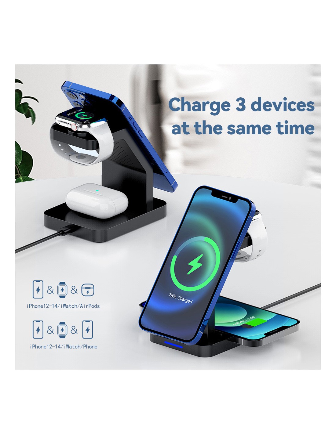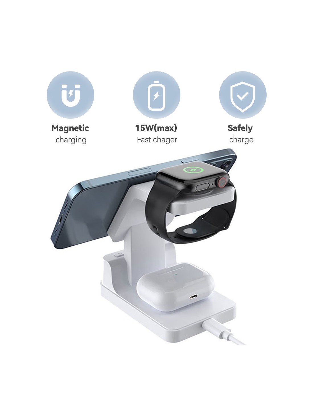 Este carregador sem fios 3 em 1 é a solução ideal para quem procura praticidade e organização no seu espaço. Compatível com smartphones, smartwatches e auriculares, oferece carregamento rápido e eficiente enquanto mantém os seus dispositivos sempre ao alcance.