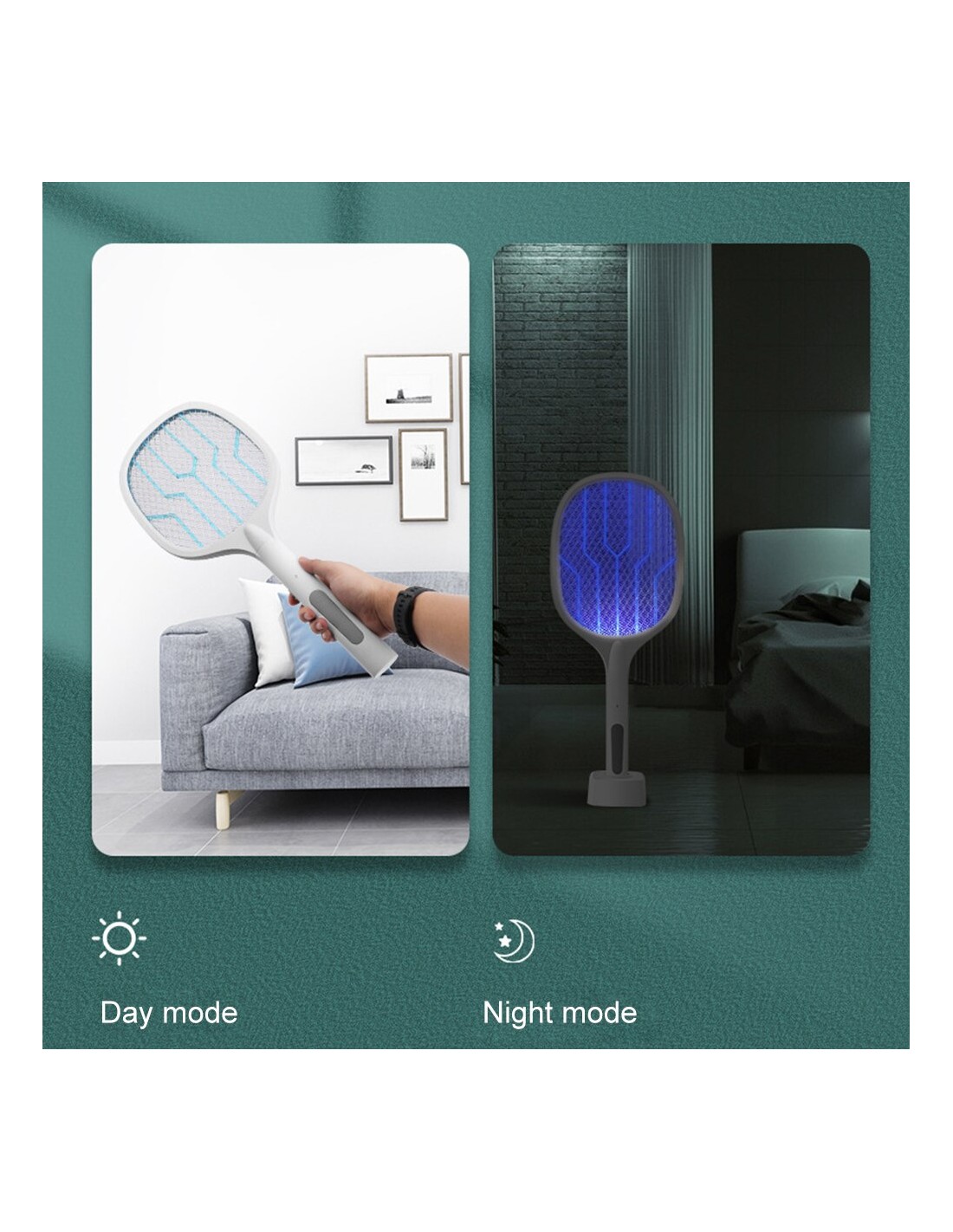 Raquete elétrica mata-insetos com luz UV e base para uso automático. Ideal para eliminar mosquitos e outros insetos de forma segura e prática. Carregamento USB e design portátil para maior conveniência no dia a dia.